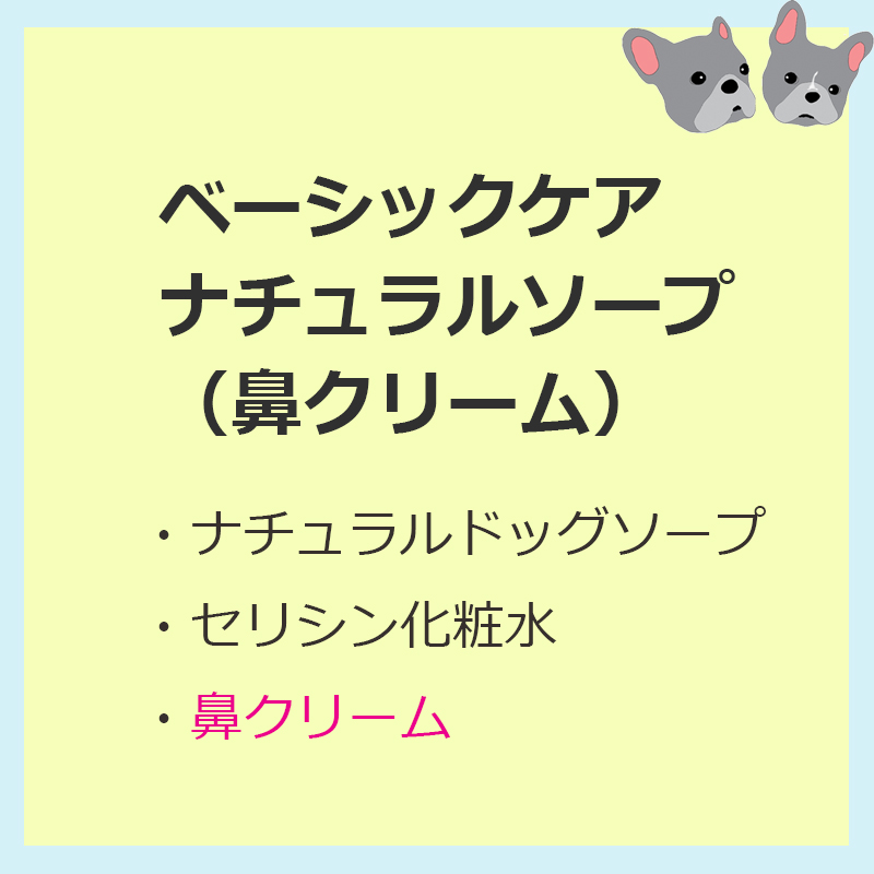 ベーシックケアセットは、ドッグソープ、セリシン化粧水、肉球クリームまたは鼻クリームの3点セットになります。ベーシックな「洗浄と保湿」ができる商品です。