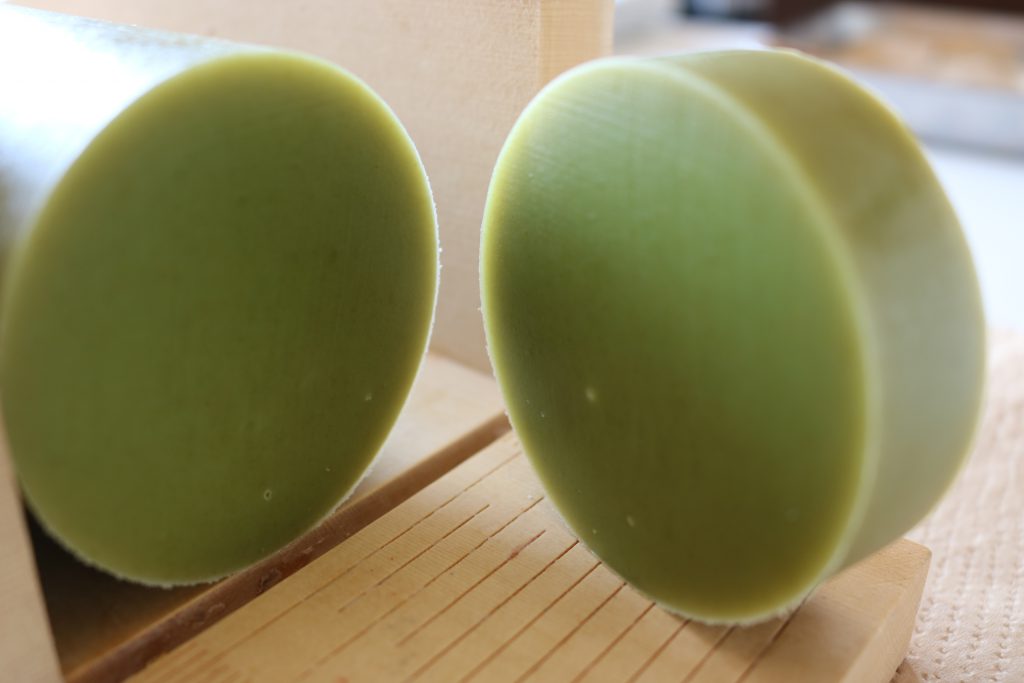 桑の葉石けん、作りました。桑の葉パウダーでこんなに濃い緑色に♡抹茶感があります。