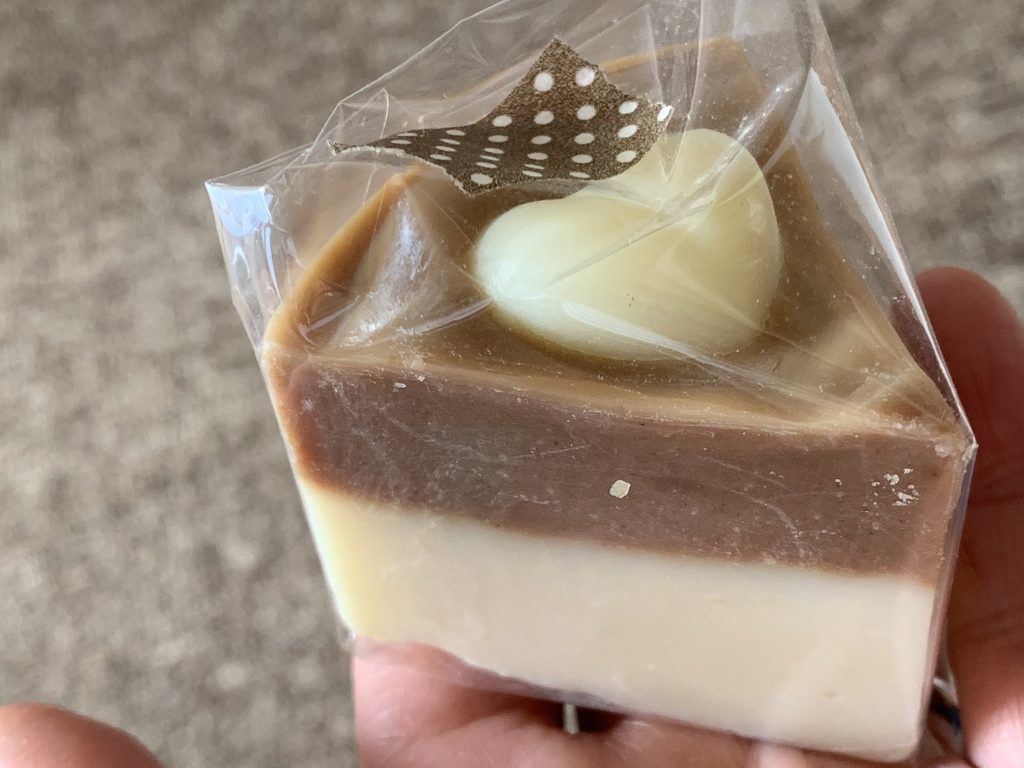 懐かしい。ケーキみたいな石けん作りに凝っていた頃の石けんで、ココアパウダーで色付けしています。