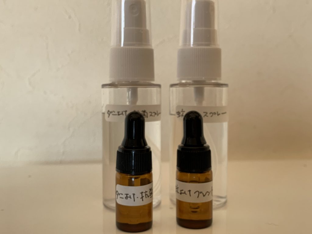お散歩用に蚊よけ、ベッドまわりにダニよけ&抗菌効果のある精油で2本作りました。