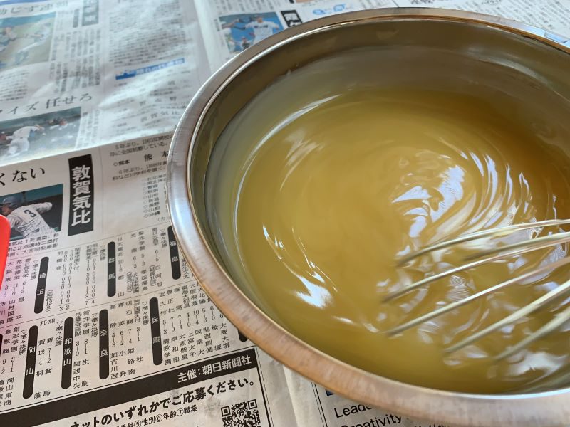 他のオイルと苛性ソーダを入れると、濃い黄色に。