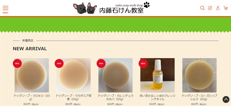 内藤石けん教室ショッピングサイトでは、手作り石けんや保湿ケアなどわんちゃんのためのケアグッズを販売しています。