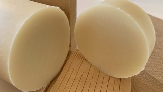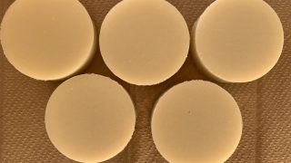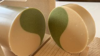 ローズヒップとハイビスカスのインフューズドオイルを作り、シルクをオプションに石けんにしました。型入れ前はオレンジ色でしたがカットの時はこんな感じの色に。なめらかで美味しそうな石けんになりました。乾燥入りまーす。