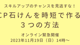 オンラインレッスン オンライン開催決定!CP石けんを時短で作る3つの方法 先日お知らせしました「CP石けんを時短で作る3つの方法」アンケートにご協力くださった皆さま、ありがとうございました。オンデマンド(動画配信)のみを予定しておりましたがオンラインのご希望を多数いただきましたので急遽、オンラインでの開催を企画し... 2023.11.12 オンラインレッスン